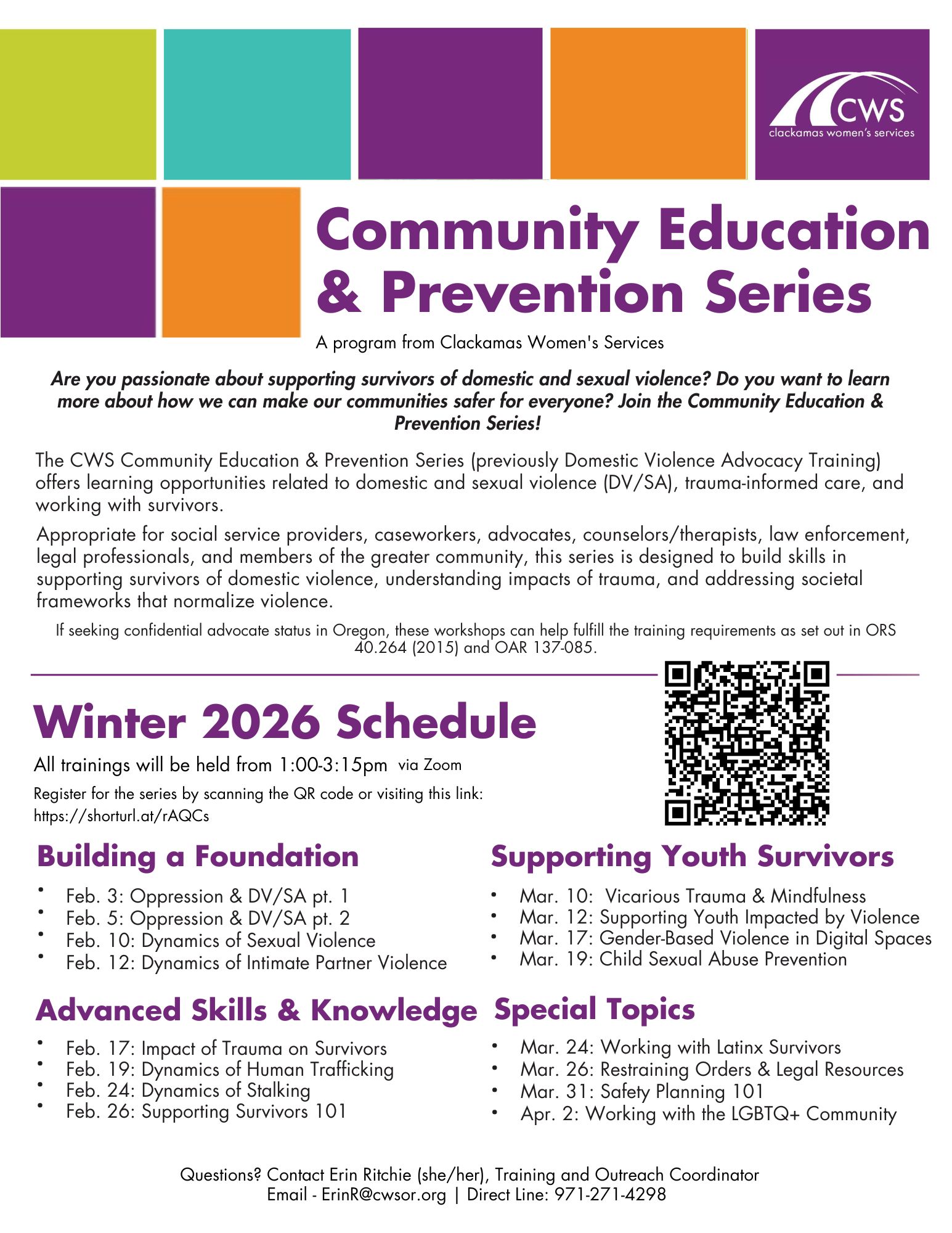 The CWS Community Education & Prevention Series (previously Domestic Violence Advocacy Training) offers learning opportunities on topics related to domestic and sexual violence, trauma-informed care, and working with survivors.